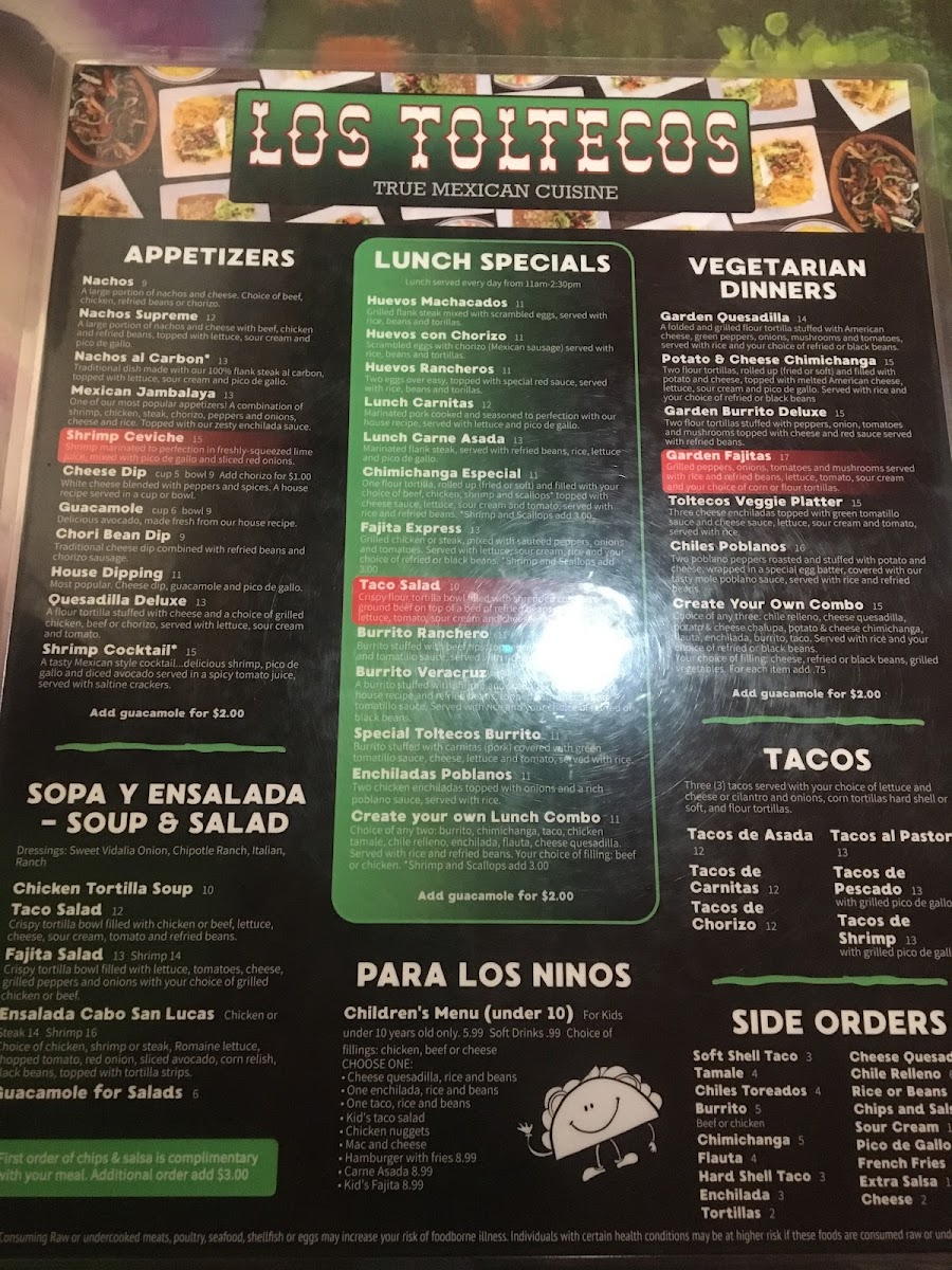 Two flour tortillas, rolled up (fried or soft) and filled with potato and cheese, topped with melted American cheese, lettuce, sour cream and pico de gallo. Served with rice and your choice of refried or black beans